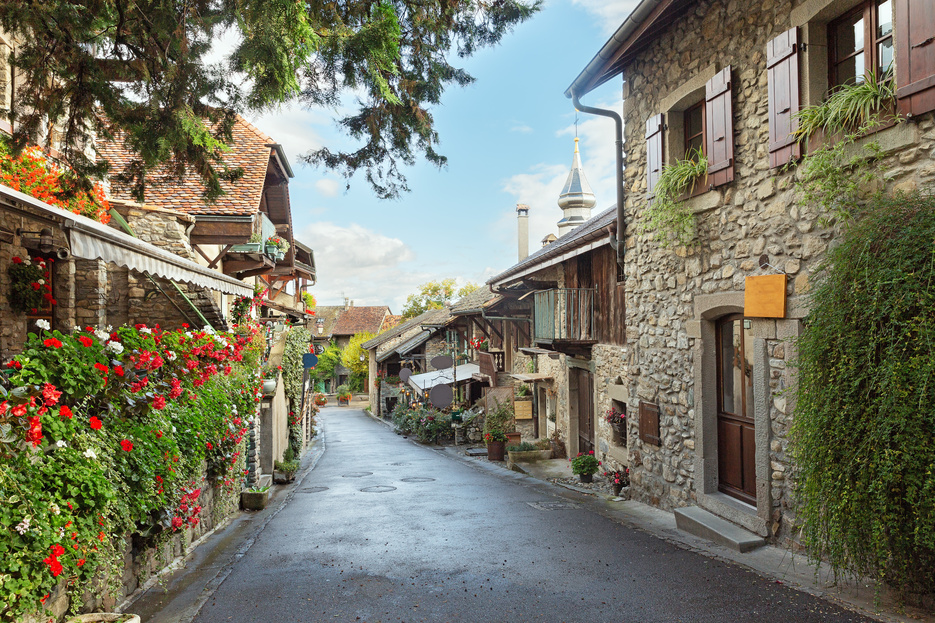 La cité médiévale d’Yvoire. Bourg médiévale situé sur un promontoire séparant le petit lac du grand lac avec des vestiges essentiels des fortifications du 14 éme siècle.